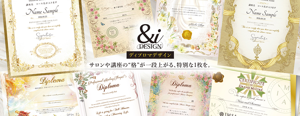 クリエイティブスタジオ『&i DESIGN』では、これまでに数多くのディプロマデザインを手がけてまいりました。 手にした瞬間に誇りと喜びを感じていただけるよう、&i DESIGN では、品格と美しさを大切にしたディプロマデザインを制作しています。 スクール・講座・セミナー・認定制度など、それぞれのコンセプトや世界観を丁寧にヒアリングし、ブランドイメージにふさわしいデザインをご提案。 修了証・認定証・修了証明書・参加証明書など、用途に応じたデザインに対応可能です。 |